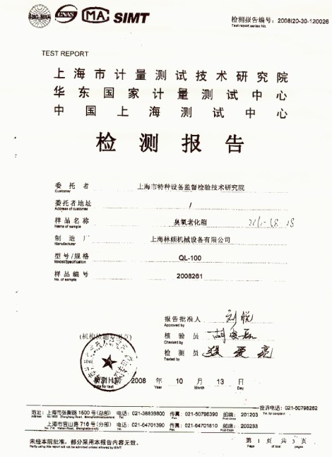 08年8月份,上海市特種設備監督檢驗技術研究院在經過眾多篩選后最終選擇林頻,與我司正式簽約一臺型號為QL-100的臭氧老化試驗箱,在出廠前嚴格把關,并已通過上海計量院第三方檢測合格,現已驗收合格并已成功交付使用.因為我們專業,所以值得信賴! 林頻全體人員歡迎您的咨詢!TEL:024-83503936 31314378 http://www.tttmac.com